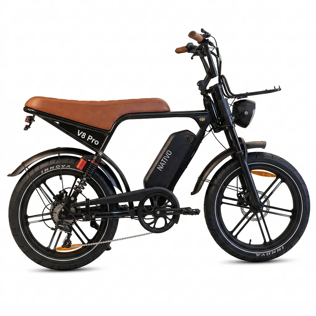 Com motor de 1000W e bateria de lítio 48V 15Ah removível, a V8PRO da VoltzMob foi feita para quem quer ir além. Rodas fat de 20×4.00″, quadro em aço robusto e suspensão hidráulica dianteira com traseira a molas garantem tração e conforto tanto no asfalto quanto fora dele. Autonomia de até 50 km por carga e recarga completa em 6 a 7 horas.